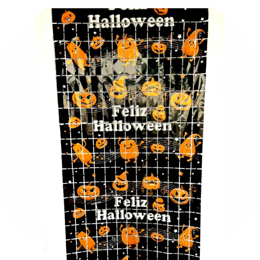 Cortina Metalizada Fita Quadradinho Slimmer Hall Franja Halloween Laranja Preto